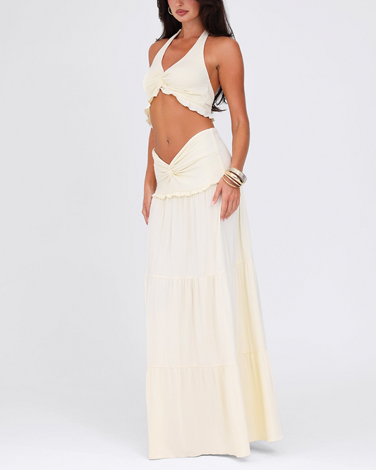 Shesways® Plunge Neck Halter Top & Ruched Skirt Set – Summer Two-Piece Outfit for Women