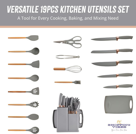 Premium 19pcs Kitchen Utensils Set: Professional & Stylish Chef Tools. Ideal Wedding Gift for Home Chefs. BPA-Free, Non-toxic Silicone Kitchenware to Modernize Your Kitchen (Grey)