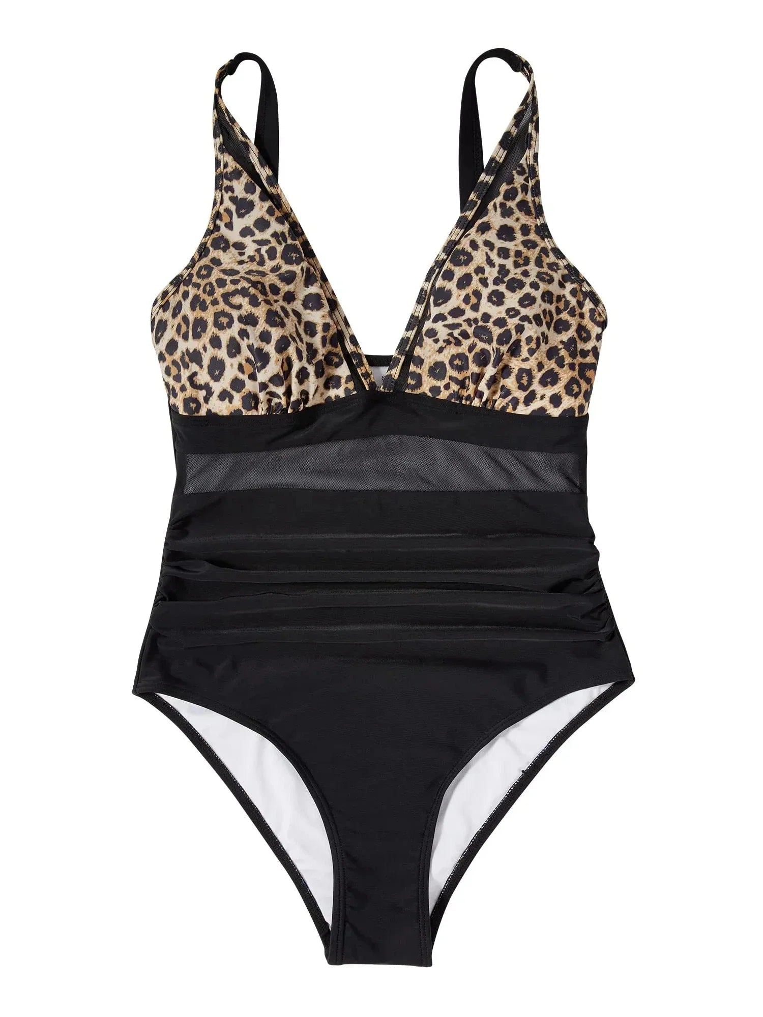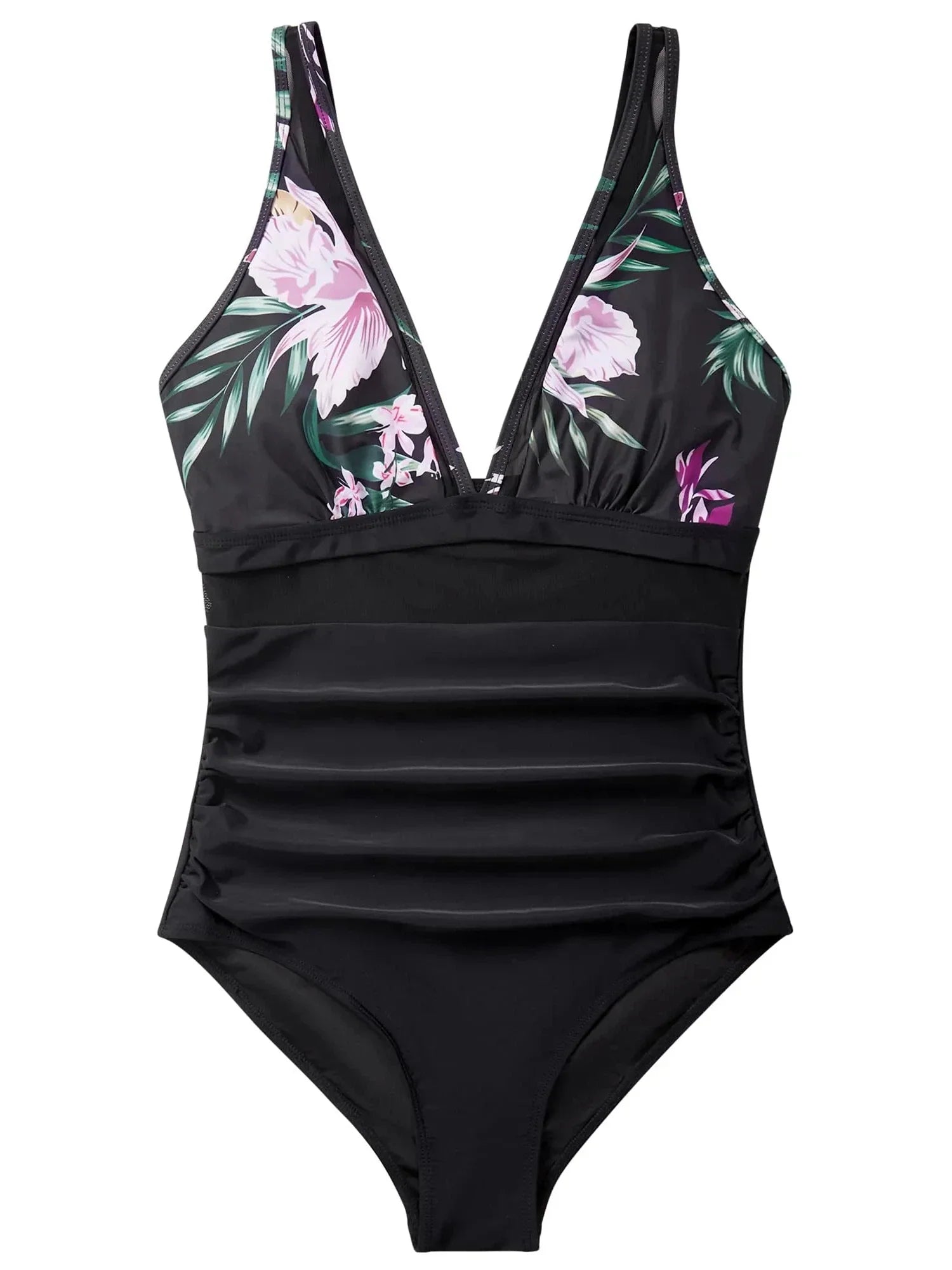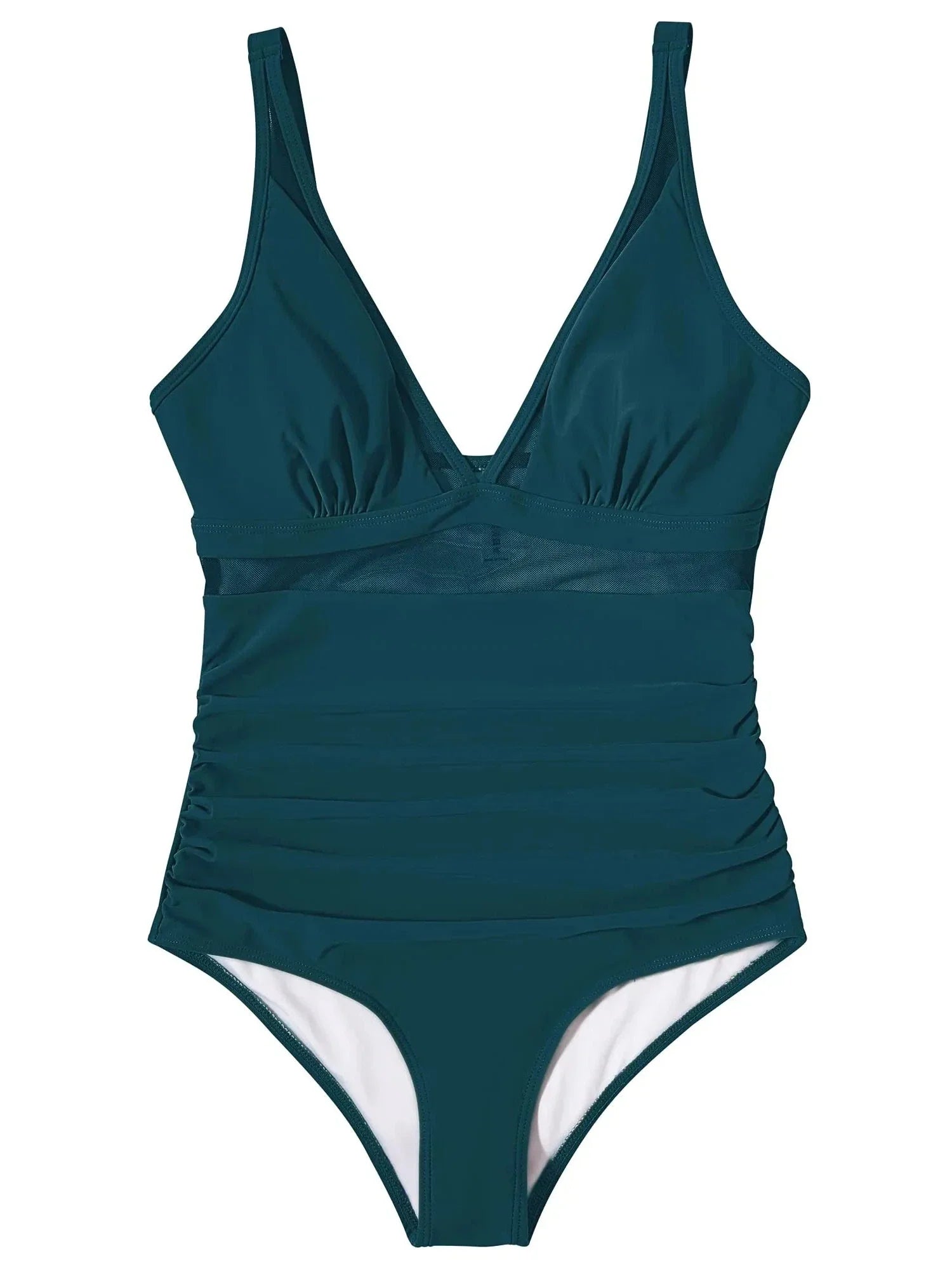 Sexy Mesh High Waisted Swimsuits: Deep v neck push up monokini swimwear, Sheer mesh high waist modest bathing suit