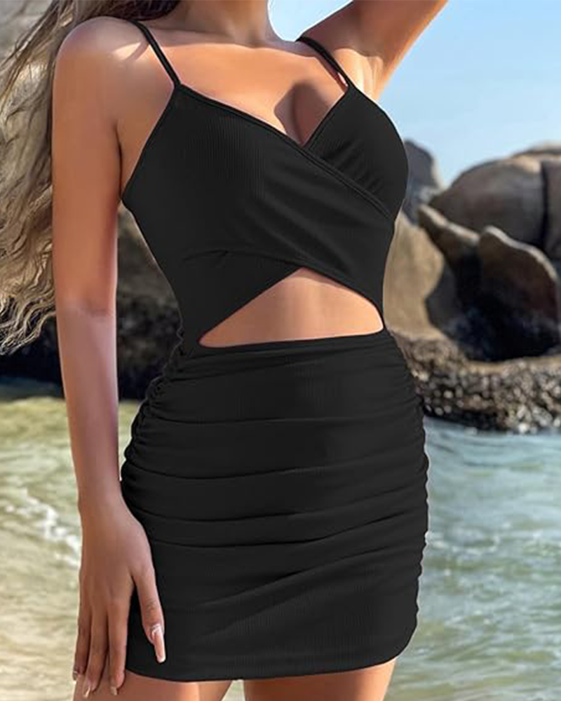 Made from a soft and stretchy blend of polyester and spandex, this body-hugging mini dress is both lightweight and comfortable. It features a deep V-neckline, a bold front cut-out at the waist, and figure-enhancing ruched details – all tailored to accentuate your curves effortlessly.