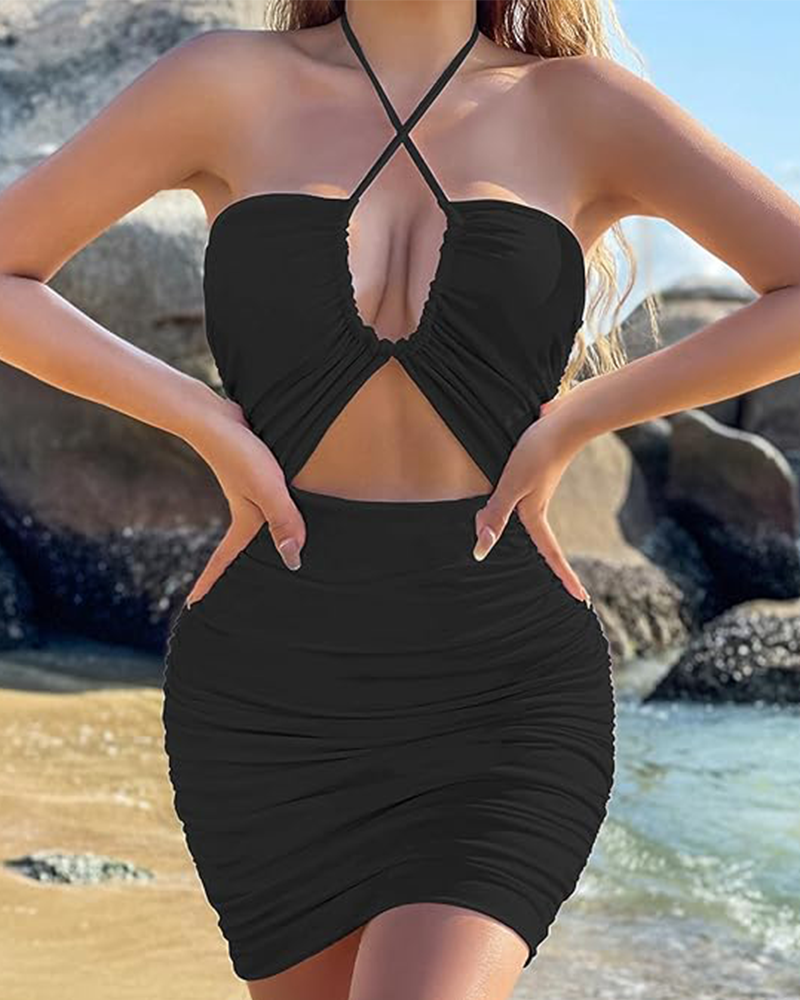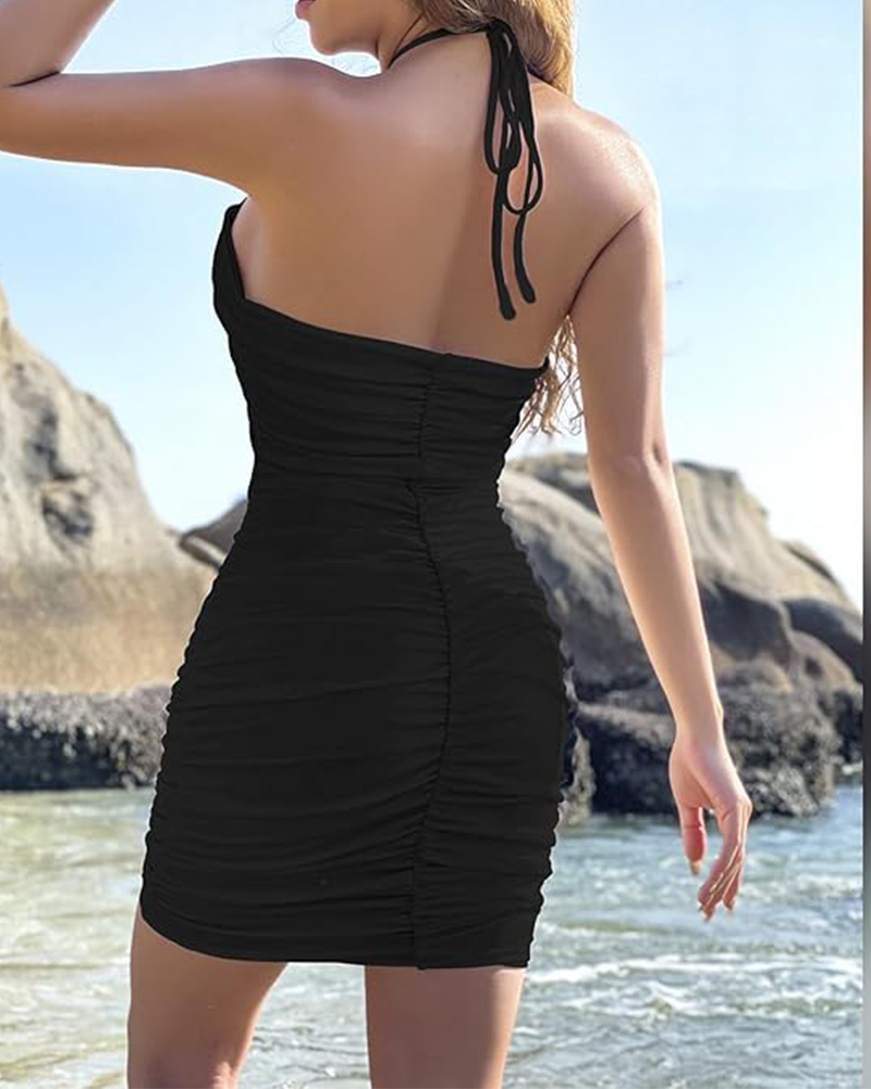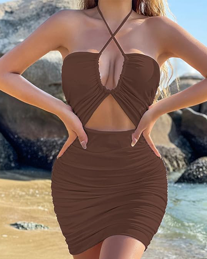 Crafted from a premium blend of polyester and spandex, this dress hugs your curves with soft, stretchy comfort and a flattering bodycon fit. Featuring a sleek cut-out front, halter neckline, and ruched detailing throughout, it’s the ultimate statement piece for your next night out.