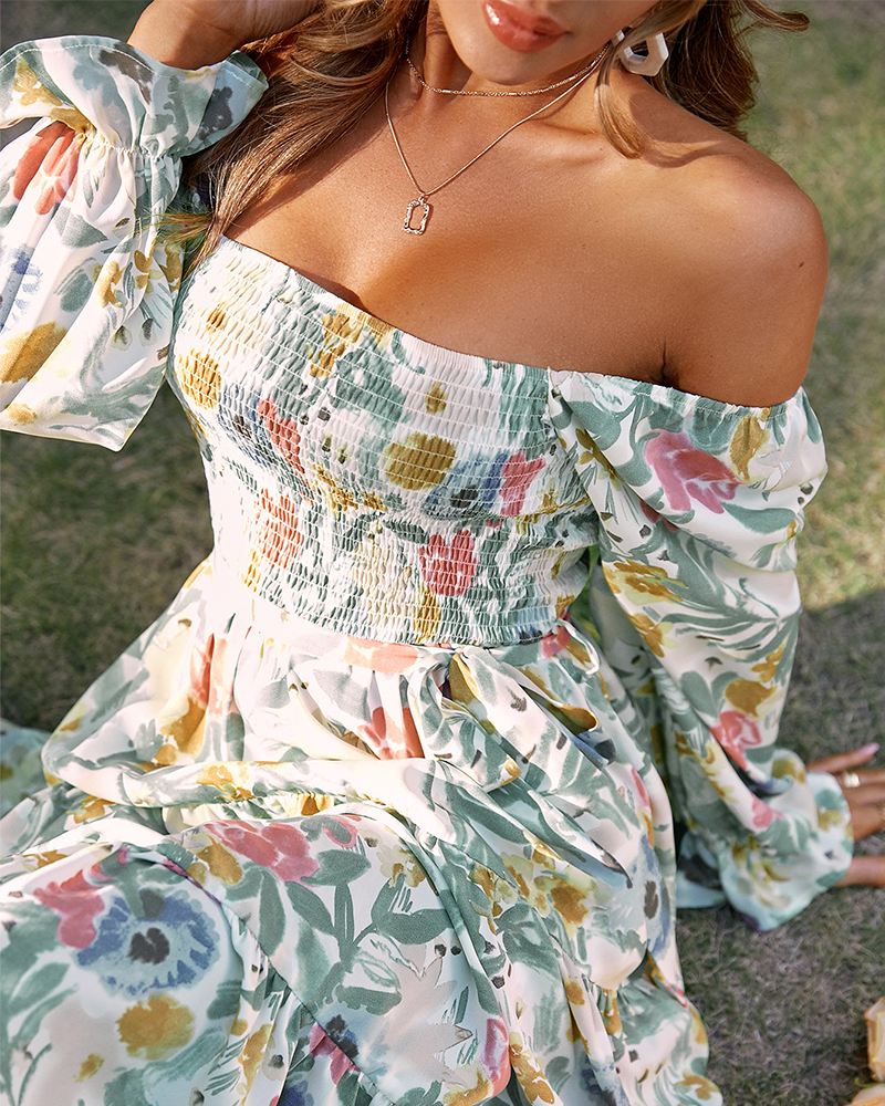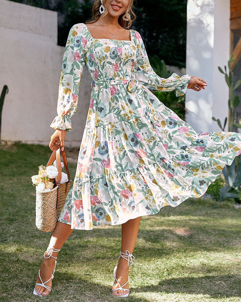 Crafted from high-quality woven fabric, this maxi dress features a chic square neckline, flared long sleeves, and a high waist that flows into a loose, flowing silhouette. The delicate all-over print and matching waist belt add a touch of elegance and countryside charm — perfect for tea parties or as a modern-day princess look.