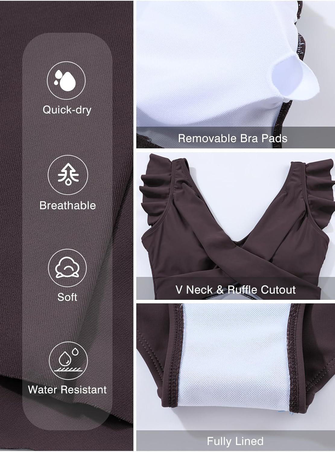Feature: Soft removable pads, v neckline, ruffle sleeve, front cutout, ruched details at the waist, v back, fully lined, a modest but flattering swimwear